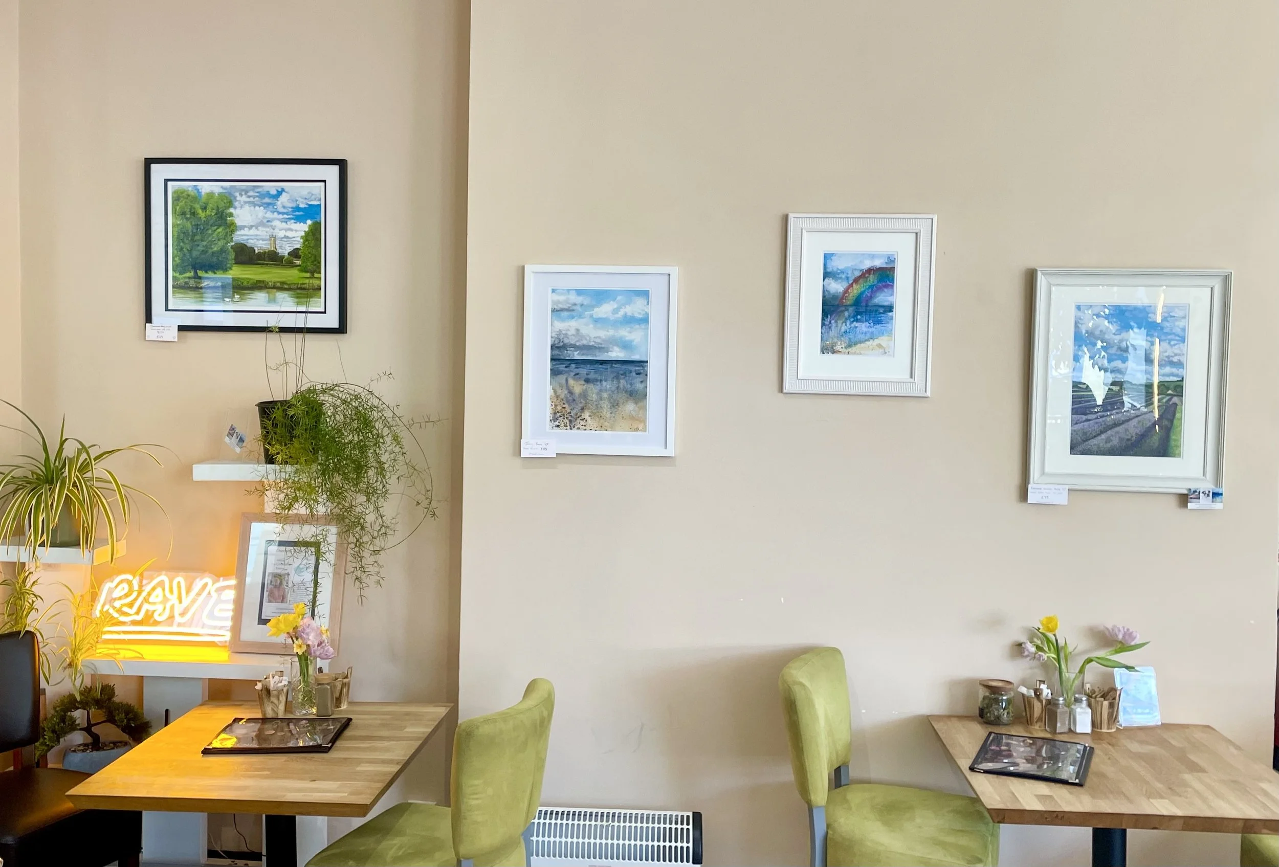Now that Winter is behind us, and Spring is here, I switched out my ‘Winters Quiet Glow’ painting from the Phoenix cafe in Cirencester and changed it for a ‘Rainbow’ print. It’s a fun, hopeful, and uplifting piece and I think works well on the wall alongside the others.