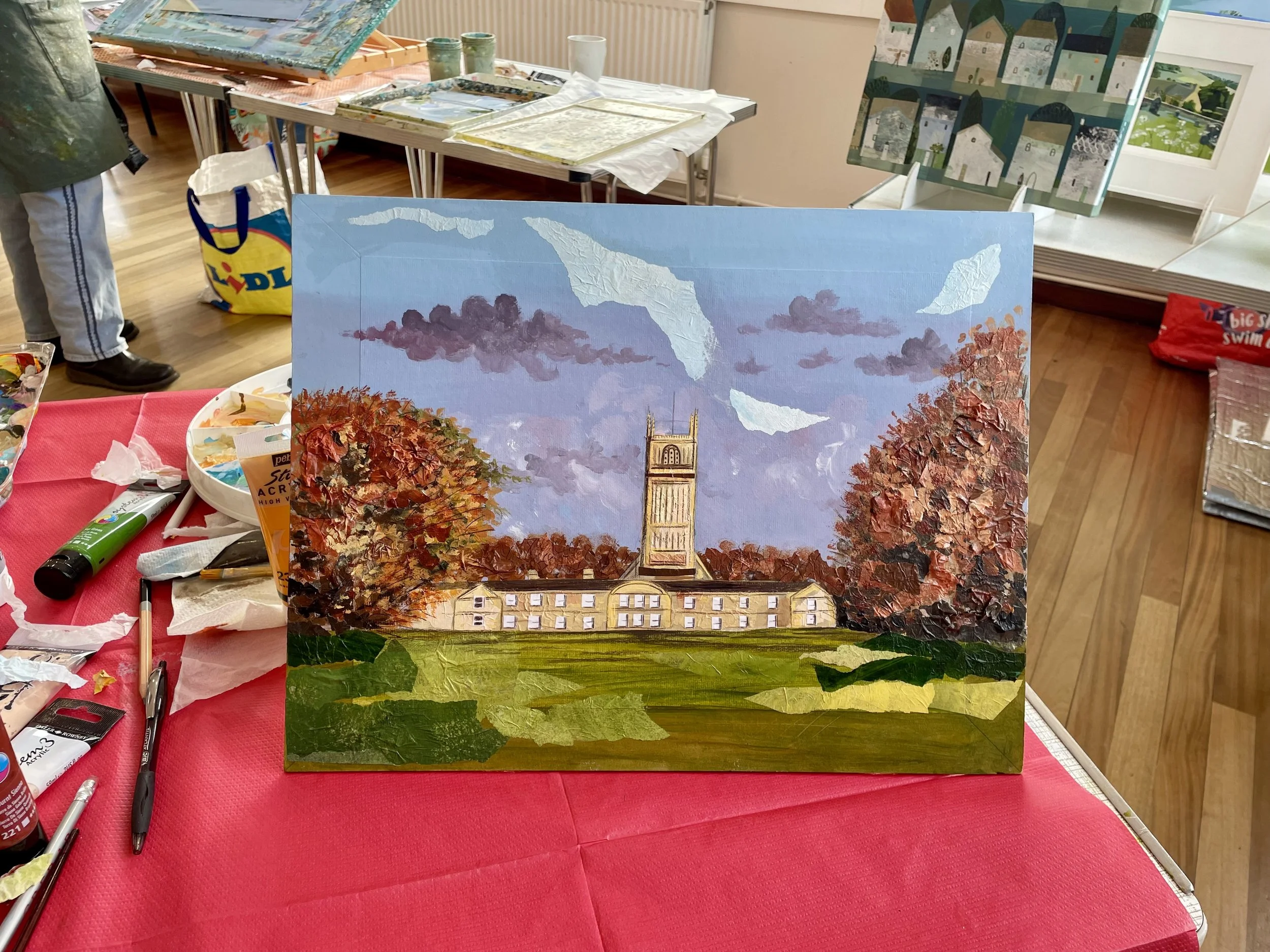 Last weekend I spent the day in the beautiful Cotswold Village of Broadway, at a workshop run by the artist Claire Henley. Broadway Arts Festival runs a huge array of art courses, and I try to book myself on to one or two a year, to keep techniques fresh and fun! This particular class was focused on using collage to portray a Cotswold scene, and of course, I chose Cirencester. I had a great time, and finished this piece during the day. It’s going to inspire a bigger painting, which I plan to paint in oils, but this acrylic piece deserves its own moment. It’s the viewpoint from the back of the Bathurst mansion house, whilst standing in Cirencester Park, and a route I often walk with the dog. The trees were layered up with lots of tissue paper, and if you look closely, so is the church! The tissue paper in the sky gives a sense of moment and allows your eyes to move across the piece, giving (I hope!) the illusion of an Autumnal wind. It’s going to be available as a greeting card soon, to accompany my other local Cotswold scenes.