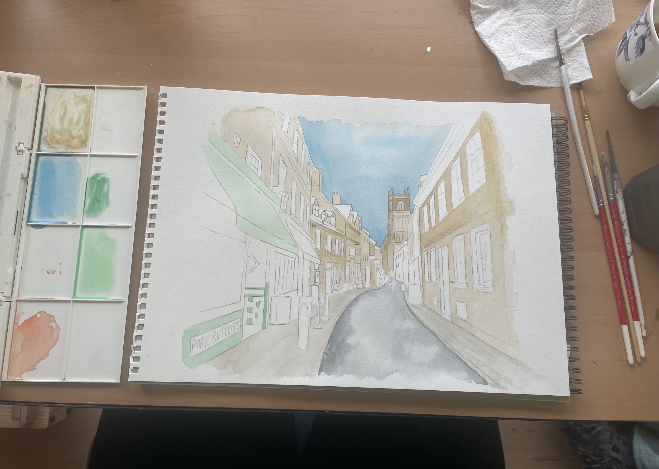Talking of local scenes, Ive just started a new Cirencester watercolour. This time, Im focusing on Black Jack street. It’s in its very early stages, but the bones are there and I think it will be a great addition to my local portfolio.