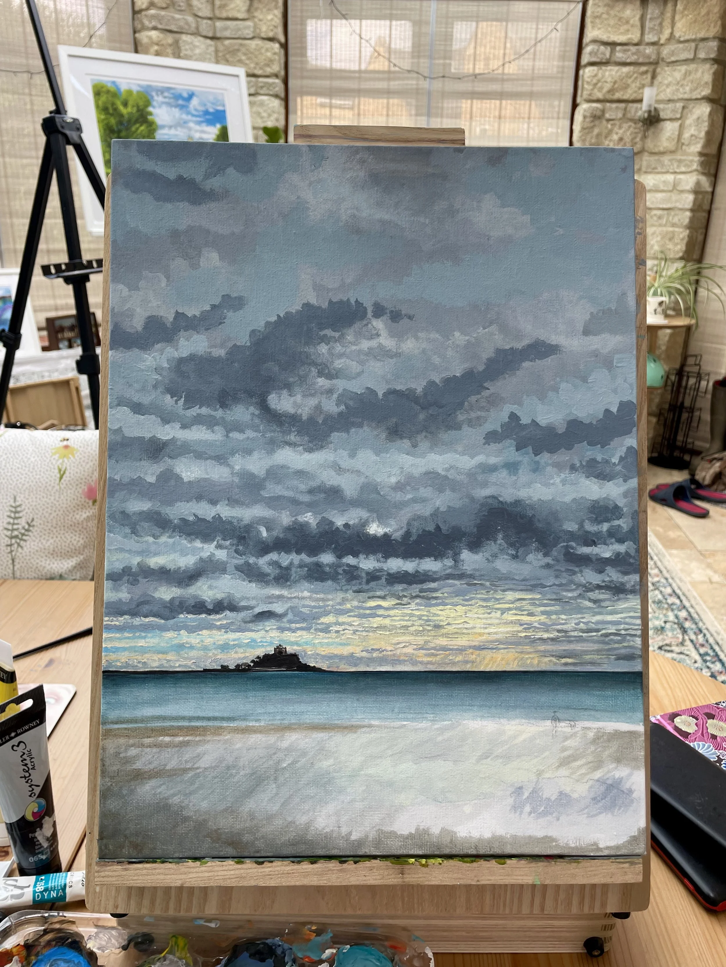 At the start of October I made a start on a new acrylic piece, which I’m still yet to name. It showcases one of my favourite places, St Michaels Mount in Marazion, at dawn. Inspired by a walk, I’m debating whether to add a person and their dog (or two!) looking out towards the mount. I’ve sketched them in, but they may not stay (but probably will!).